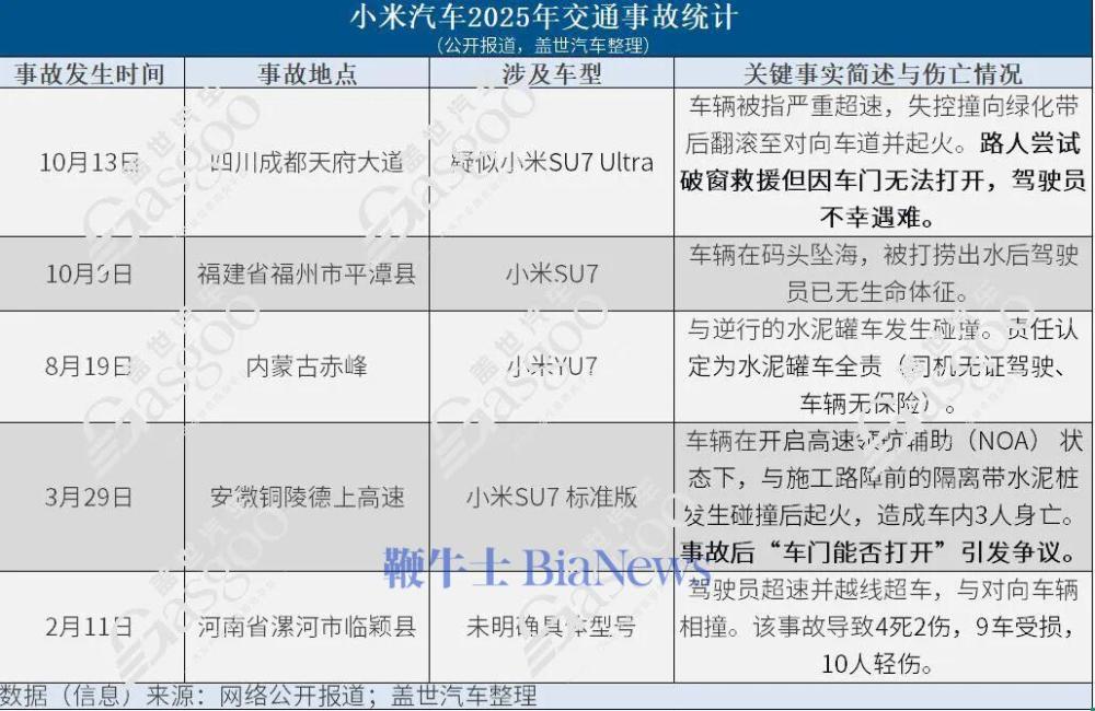 图片来源:成都公安 事故现场非常惨烈。从网络流传的视频来看,虽然有路过的人员全力施救,但是事故车辆的车门始终打不开,救援以失败告终。目前,事故正在进一步调查中。 截止发稿前,关于本次事故更为细节的信息和数据,并未有官方或者权威部门进行公布。盖世汽车也只能根据已公布信息进行合理推测。我们最为关注的,是那道打不开的车门,究竟是何原因?那道打不开的车门,困住的不只是遇难者,还有更多。 小米汽车事故过程初步回顾 从网络流传的视频和成都公安公示的信息,小米汽车事故的基本情况已经很清晰。 10月13日凌晨,有网友拍到成都天府大道主干道发生一起交通事故,涉事车辆疑似小米SU7 Ultra。 据事故现场流出的相关视频、图片及现场目击者等信息显示,涉事车辆在行驶中先是摇摆不定,随后超速失控,先与绿化带发生碰撞,随后翻滚至对向车道并起火。 车辆起火后,驾驶位人员被困车内,多名路过市民立即上前参与救援。有人徒手或用工具猛砸车窗,但车门始终无法打开。网络流传的视频还显示,后来有人想办法把车窗砸开了,但车门还是打不开。 成都市公安局交通管理局的通报也还原了事故的过程: 经初步调查,当事人邓某某(男,31岁)驾驶川AC****9号小型轿车,沿天府大道由北向南行驶。车辆在通过天府五街路口进入天府大道南段后,与前方同向由李某驾驶的川AA3号小型轿车发生碰撞,随后越过道路中央绿化带,起火燃烧。 成都交警在通报中还特别提到,“驾驶员涉嫌酒后驾驶机动车”,很可能从遗体中的组织中检测到了酒精的成分。 截至本次发稿,涉事车辆品牌方还未发布相关情况说明。 那道打不开的车门归因何处? 从交通法规的角度来看,小米汽车成都事故的定责已经很明确,即便没有酒驾,也是驾驶员的责任。剩下的疑问便在于“车门为何没能打开”。 小米汽车因事故打不开车门并非首次。今年3月29日,3名女生驾驶小米SU7前往安徽铜陵,但在高速行驶路段撞上护栏后,引发电池燃烧,最终造成车内人员伤亡。有家属提出“碰撞发生后,车门无法打开”的质疑。 这一次,小米汽车事故发生之后,车门无法打开的问题再次发生。 从网络上流传的事故现场视频来看,车辆发生事故之后,有热心群众试图打开车门,将乘员解救下来,不过救援人员始终无法通过门把手开启车门。随后,救援人员用器具敲碎玻璃,试图从内部打开车门,车门依旧没有被打开。另外,还有人试图通过脚踹等强力形势打开车门,依旧未果。 图片来源:抖音视频截图 小米汽车事故之后,为何车门打不开?为此,盖世汽车联系了一位汽车产品方面专家,在已知的信息之下,进行了有限的、尽可能合理的探讨。 第一个讨论点,事故车辆是否因速度过快,发生碰撞之后车门变形,从而无法打开? 有现场目击者描述,事故车辆在撞击后出现车门变形、车窗破裂等情况。救援过程中发现车门把手卡滞、无法正常拉出,且主驾位置车门存在疑似内部机械结构损坏。 为此,产品专家指出,有网络流传的信息显示,车辆发生事故之时,“以100-150km/h的速度失控撞击绿化带。”如果按照这样的速度发生碰撞,可能导致车门框、B柱等部位严重挤压变形,物理上卡死车门,即使门锁已解开也无法从内外推开。“对比网络流传的事故视频来看,事故车辆似乎没有严重的形变。当然,不排除车门内部结构的损坏,从而导致车门无法打开。” 第二个讨论点,是否为小米汽车车门设计存在缺陷,发生碰撞之后无法自动解锁? 按照相关法规要求,车辆在预设的速度(如超过20kph)或其他条件下,系统可以自动锁止车门,防止不慎误开车门。现行强制性国家标准中提到,当发生碰撞之后,车身变形不要影响车门打开,对于自动落锁功能碰撞后能否自动解锁,并没有提及。 而根据联合国法规、国标修订版以及C-NCAP评价规程等,已提出了自动落锁功能的详细试验步骤,明确试验前锁止、碰撞后解锁的基本要求。 有媒体报道,小米汽车客服曾做出过回应,当车辆发生碰撞并收到碰撞信号时,车门会自动触发解锁机制,此时可通过拉动门外把手开启车门。 对于此,在产品专家看来,“解锁意味着车门具备可打开的条件。车辆在正常行驶时为安全起见会落锁,碰撞后车门应能正常解锁,以便成员打开车门逃生。” “我从视频中也看到,有人敲碎玻璃,试图从里面开车门,最终车门也无法打开。不排除车辆内部没有设计安全机械式系统。”产品专家特别申明,在官方和检测机构未给出足够信息的情况之下,无法确定是电子系统失效,没有机械式安全冗余系统,还是结构设计缺陷问题。 第三个讨论点,小米汽车成都事故车门打不开,是否跟隐藏式门把手有直接关联? 信息显示,小米SU7采用的是半隐藏式门把手。小米集团创始人雷军曾介绍,小米SU7的半隐藏式门把手“采用固定式设计,通过按压内部微动开关实现电动解锁,无需物理抬起就能开门”。 也就是说明,这种门把手本质上仍是电控开关,而非传统的机械结构。也有小米的车主表示,其购买的小米SU7标准版车门内都应急机械拉手,可在断电状态下紧急打开车门。另外,小米产品手册也详细提供了从后备箱紧急逃生的方法。 当然,应急机械锁拉手于车内,需要乘员保持状态清醒和具有一定行动能力才能顺利使用,对于车外救援人员来说,打开车门主要通过砸开窗户,或拉动配有机械开门机构等方式。 产品
