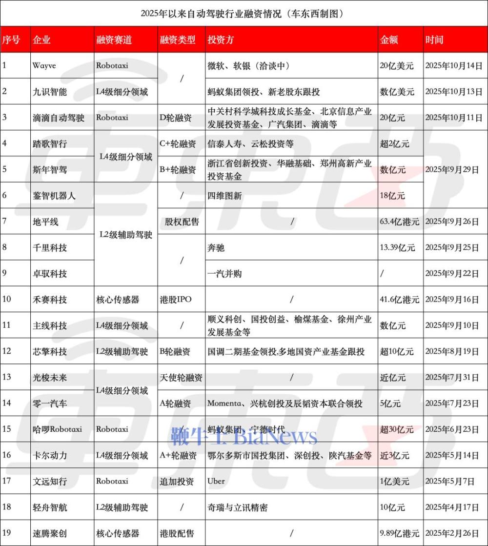 车东西10月14日消息,近一个月,自动驾驶行业密集诞生11起融资,融资总额超过了292亿元,而今年以来,该行业融资事件总数已跃升至19起,融资总额已经超过367亿元。资本市场正用真金白银,为自动驾驶的商业化前景坚定地投下信任票,与前三年的资本寒冬形成鲜明对比,自动驾驶行业在2025年实现爆发。