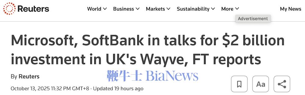 ▲路透社报道Wayve正与微软、软银洽谈20亿美元融资