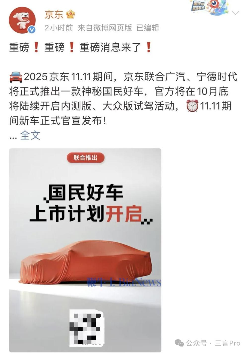 10月14日,京东在2025京东11.11全球好物节发布会上宣布,与宁德时代旗下的时代电服及广汽集团联合推出一款新能源汽车。
