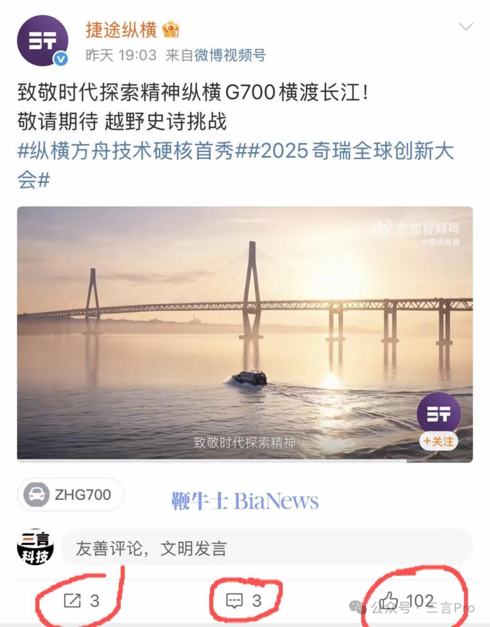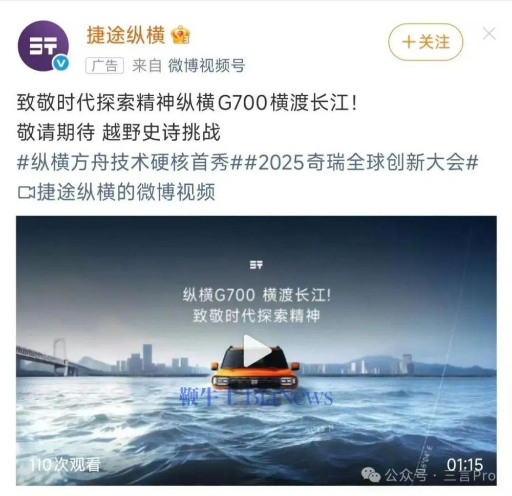 汽车横渡长江,听起来有点不可思议,但有车企就这么搞了。奇瑞旗下有个品牌捷途纵横,做了波营销,发起了横渡长江的挑战。能够看到,这个官宣微博还是投了广告,但结果好像有点尴尬。看了一眼,视频发了快一天了,有90多万的播放量,但微博评论和转发都是只有“3”个。反正不管怎么看,都觉得挺抽象的。噱头搞那么大,却没人关注……笔者搜了下,其实这辆车上个月就发布了,好像价格也不便宜,30多万呢。前段时间,奇瑞汽车执行副总裁李学用就不止一次展示水上开车。能看到车后面装了推进器,和船类似。反正不管到底实不实用,看起来确实挺有冲击力。也能看出来,这也是官方营销的一大卖点。先叠个甲,对越野车没啥偏见。因为好像网上总有各种越野“神奇操作”,所以回头想想好像“水上漂”也没那么稀奇了。这几年汽车圈太卷了,车企们也是各种奇招。现在跑赛车场都不算新鲜事了,总得搞出点新花样,才能吸引人的眼球。前有对撞卡车,现有横渡长江,以后还会有啥骚操作呢?(转载自三言Pro)