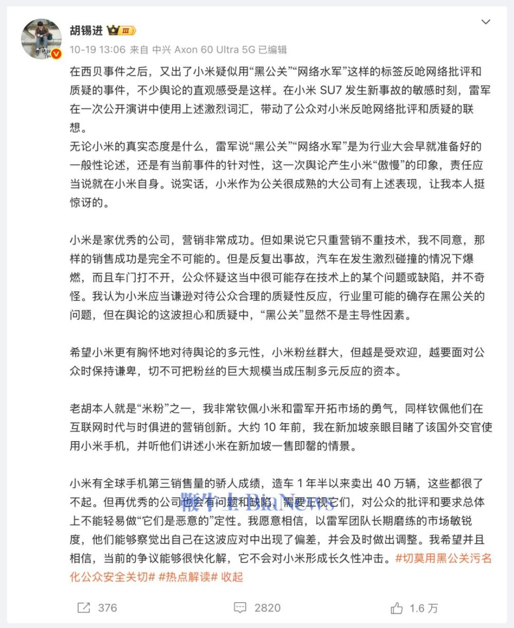 就连资深评论家、端水大师、自称米粉之一的胡锡进都看不下去了,发了条长评说小米的公关动作变形,强调小米不应该用“黑公关”来定性公众批评。