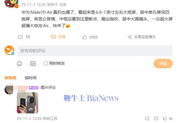 值得注意的是,有网友在评论中进一步贴出了疑似该机的真机谍照,型号为SUP-AL90,与此前在电信终端产品库中出现的Mate 70 Air一致,整体的外观设计细节与爆料基本相符。