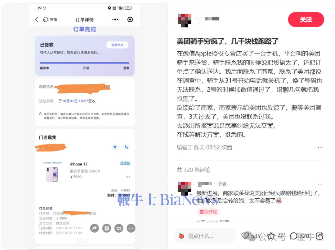 该网友于31号上午在微信Apple授权专营店买了一台手机,商家让美团骑手来送货。当天下午,骑手联系自己称把货弄丢了,并且还在订单上点了确认送达。