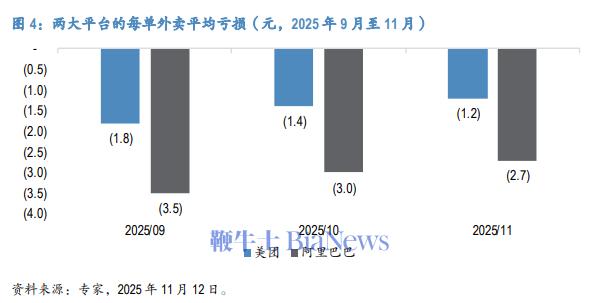 在核心的盈利能力上,平台间的差距依然显著。专家估计,美团9月每单平均亏损1.8元,10月收窄至1.4元,11月预计进一步改善至1.2元。相比之下,阿里巴巴11月每单亏损预计为3.0元,京东更高达4.8元。