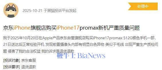 比如,有网友在黑猫投诉平台投诉称,其在Apple京东自营旗舰店购买的iPhone 17promax版手机,正常开机发现前置摄像头内部有明显白色异物,怀疑“出现严重生产质检问题”。