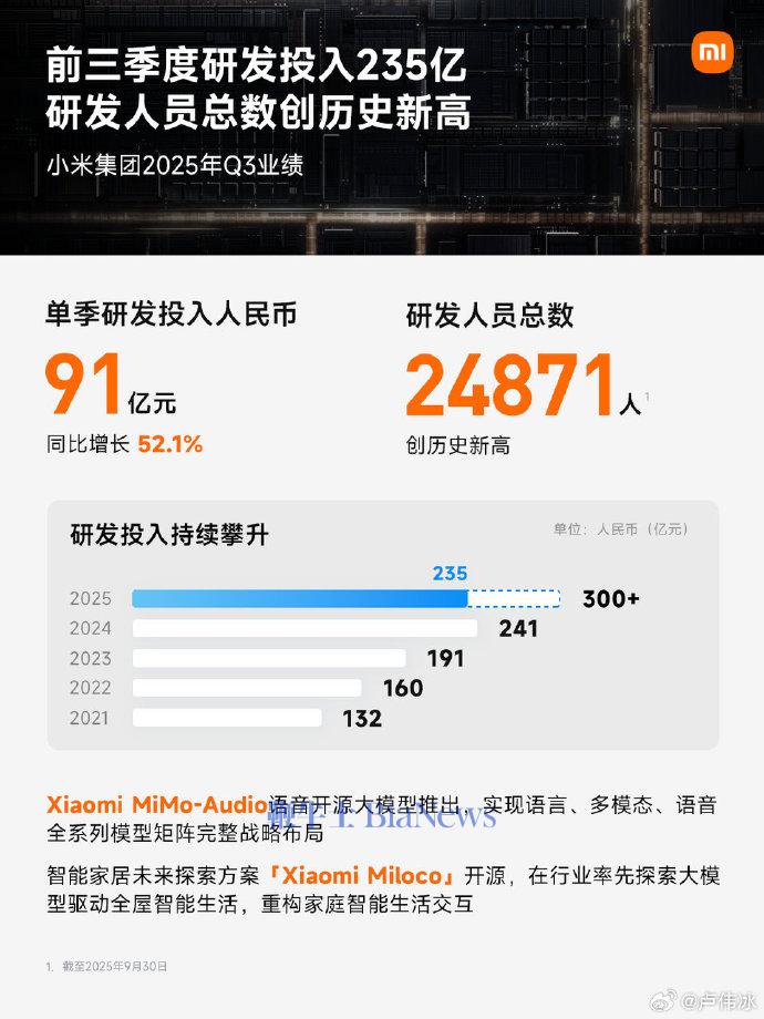 小米2025年第三季度财报显示,前三季度研发投入达235亿元,其中第三季度单季研发开支91亿元,同比增长52.1%,预计全年研发投入将突破300亿元,研发人员总数已达24871人,创下历史新高。