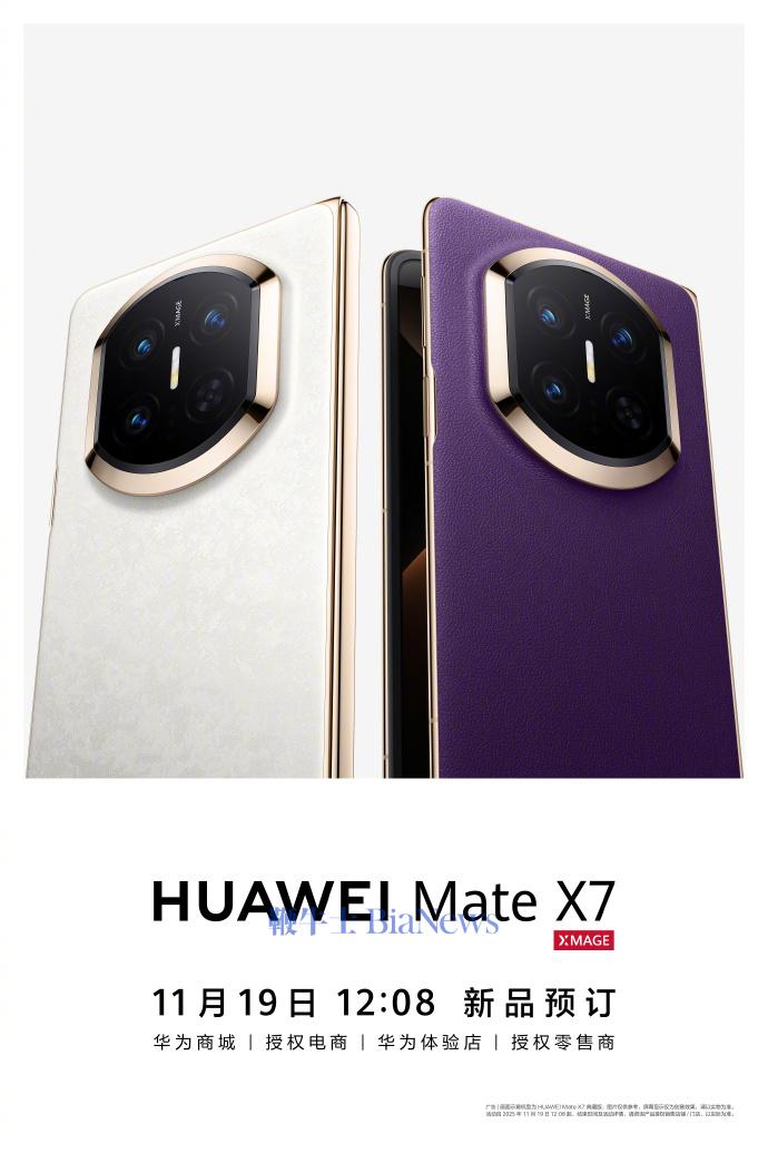11月19日,华为官宣Mate X7折叠屏手机今日12:08开启预订。
