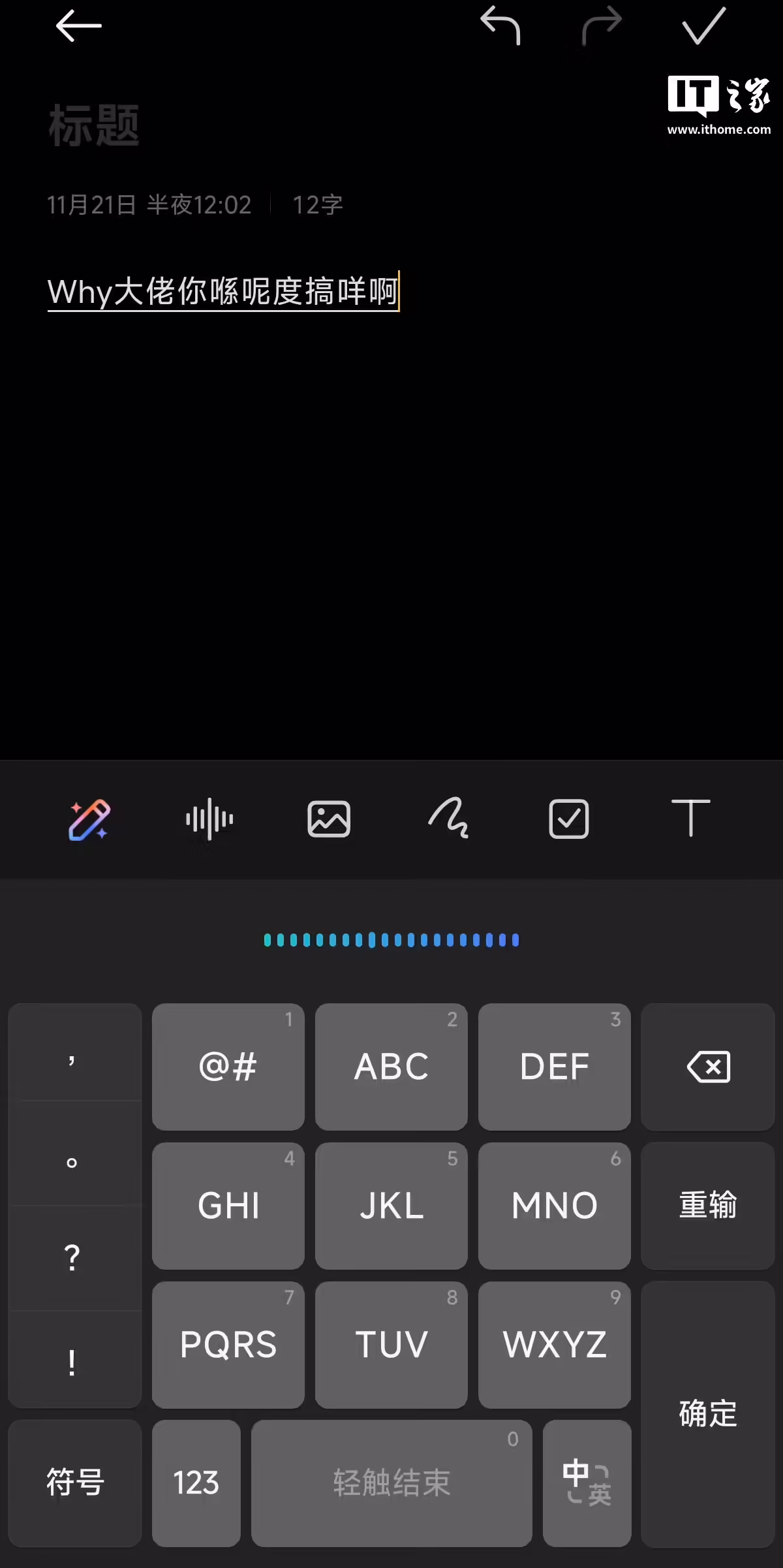 IT之家经过实测后发现,该输入法目前基础功能较为完善,可选 9 键和 26 键两种布局,支持调整键盘高度,还带有语音转文字功能,但目前并没有切换方言语种按钮,实测显示该输入法可以识别出粤语,但是在转文字过程中存在错字现象。