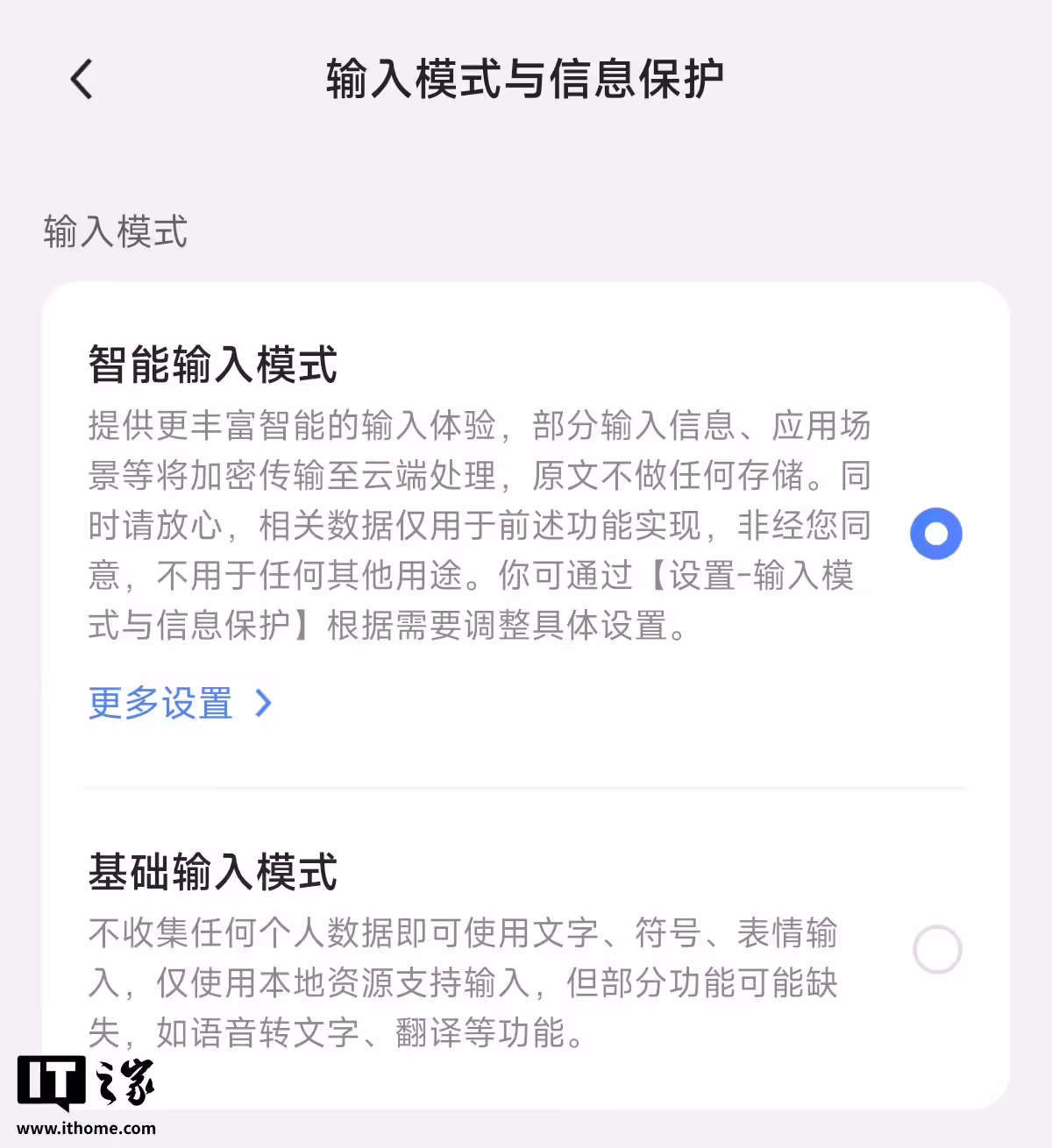 此外,该输入法还拥有智能输入、基础输入两种模式,其中前者会将部分输入信息、应用场景等传输至云端处理;而后者则不会收集任何个人信息,使用本地资源进行输入,但确实语音转文字、翻译等功能。