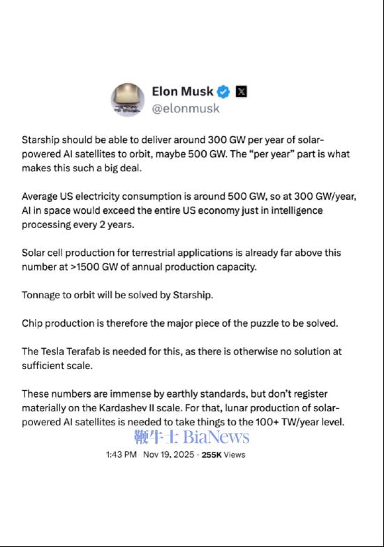 在美国沙特投资论坛之后的第二天,马斯克再次强调,这些AI卫星每年能产生100吉瓦的太阳能——相当于美国年平均用电量的四分之一。“我们已经把计划完全排出来了,会非常疯狂。”