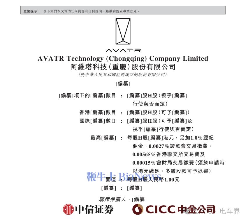 电车界11月27日消息,据港交所文件披露,阿维塔科技(重庆)股份有限公司向港交所提交上市申请书,联席保荐人为中信证券、中金公司。