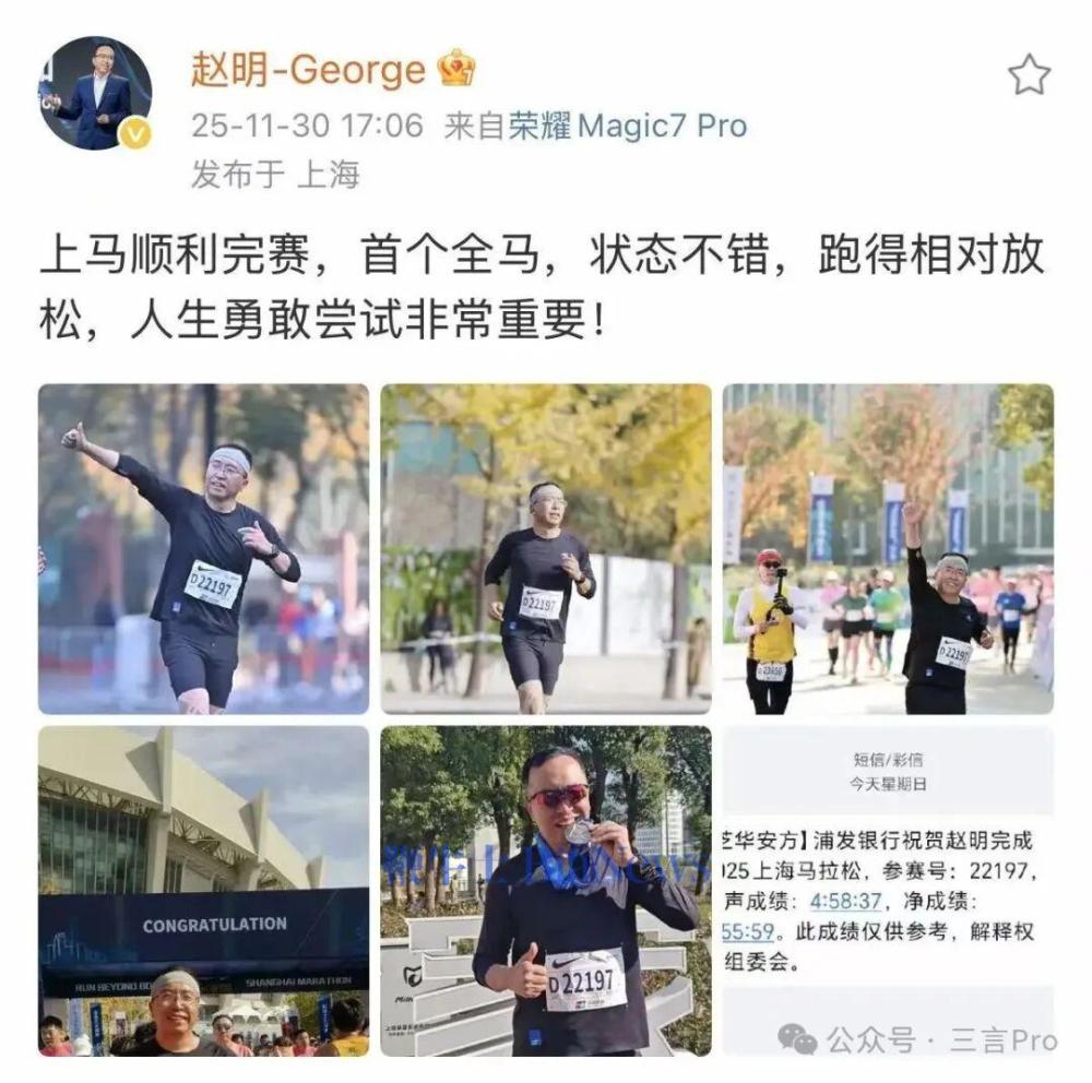 11月30日,荣耀前CEO赵明晒出了完赛上海马拉松的照片,“上马顺利完赛,首个全马,状态不错,跑得相对放松,人生勇敢尝试非常重要!”