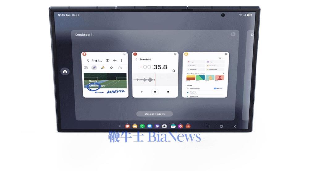 具体来看硬件规格,Galaxy Z TriFold 展开后是一块 10 英寸 QXGA 分辨率的 Dynamic AMOLED 主显示屏,支持 120Hz 刷新率,峰值亮度达 1600 尼特。展开后,提供的屏幕空间相当于三部 6.5 英寸智能手机的大小。用户可以同时并排打开三个不同的应用,甚至能在多窗口模式下调整它们的大小。此外,设备还配备一块 6.5 英寸的外屏,峰值亮度高达 2600 尼特。值得一提的是,凭借如此巨大的屏幕尺寸,Galaxy Z TriFold 成为首款支持“独立版 Samsung DeX”的手机,用户可随时随地搭建完整的移动办公环境。
