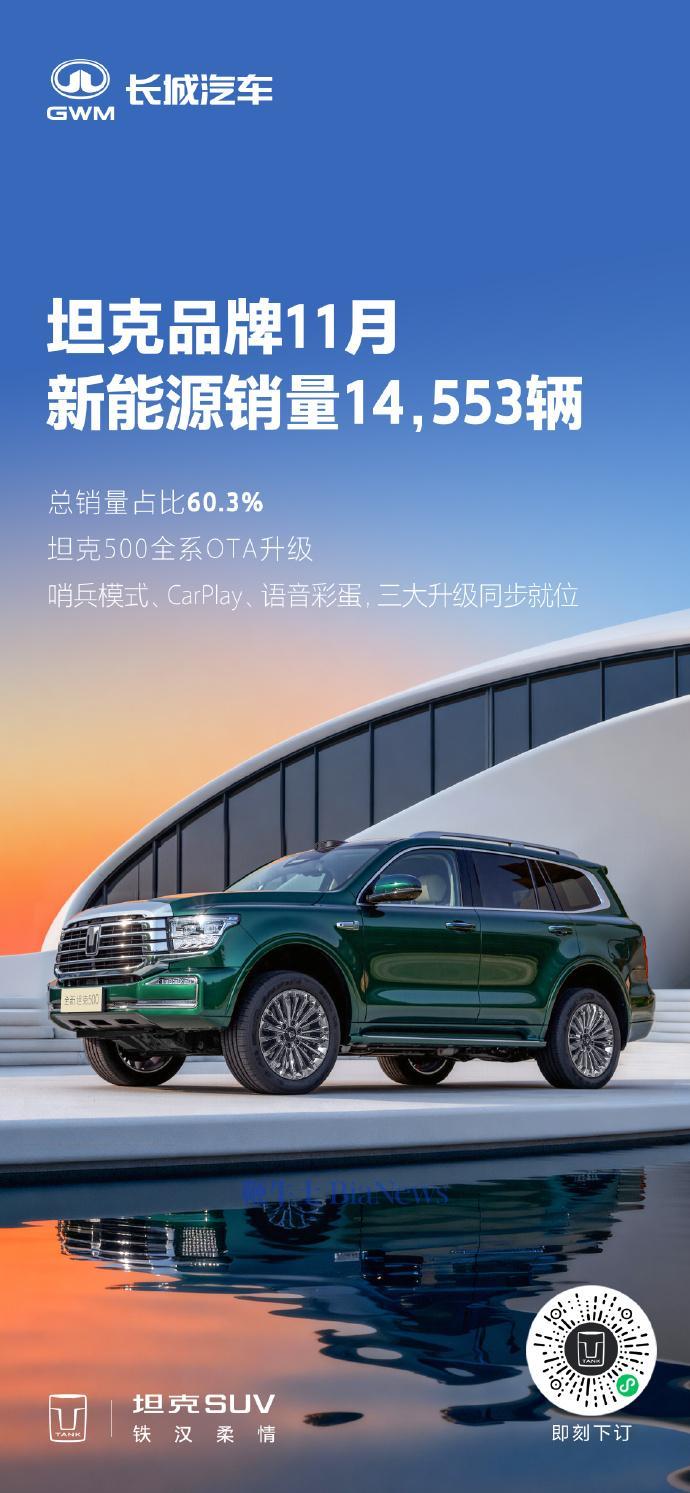 长城坦克:11月新能源销量14553辆,占总销量60.3%