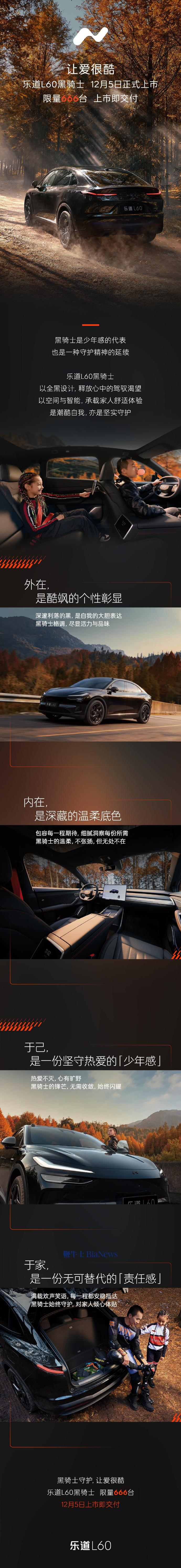 乐道汽车今日宣布,乐道L60黑骑士限量666台,12月5日上市即交付。