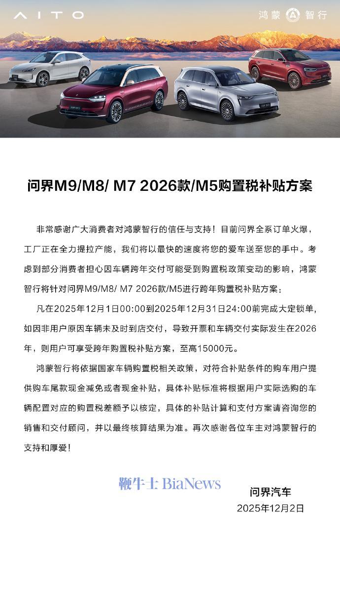 今日,鸿蒙智行官方发布问界M9/M8/M7、2026款/M5跨年购置税补贴方案。