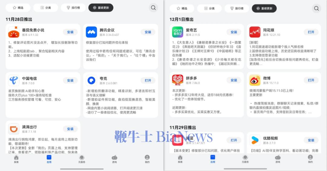 系统版本更新先不说,光是应用市场里的各个应用,一个个就跟打了鸡血似的 —— 点开应用市场里重磅更新这个版块就会看到,每天基本都有三到四个头部应用提交更新。
