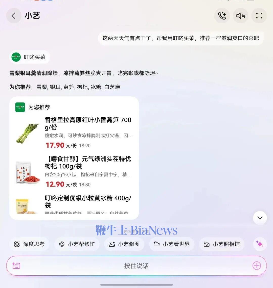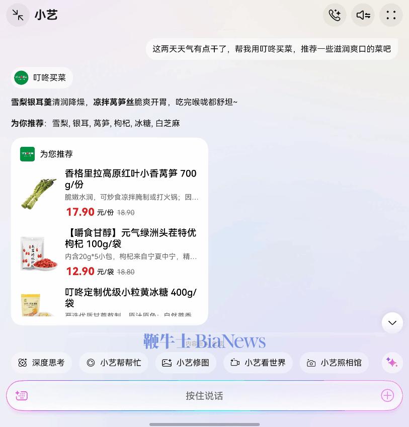 比方说我们在杭州上班,附近的外卖都点过一轮了,也不得不面临 “ 今天吃什么 ” 这样的现实问题,偶尔下厨的时候自己去找菜谱买菜又很麻烦,这时候就可以把小艺喊出来,让它用叮咚买菜推荐一个菜谱。