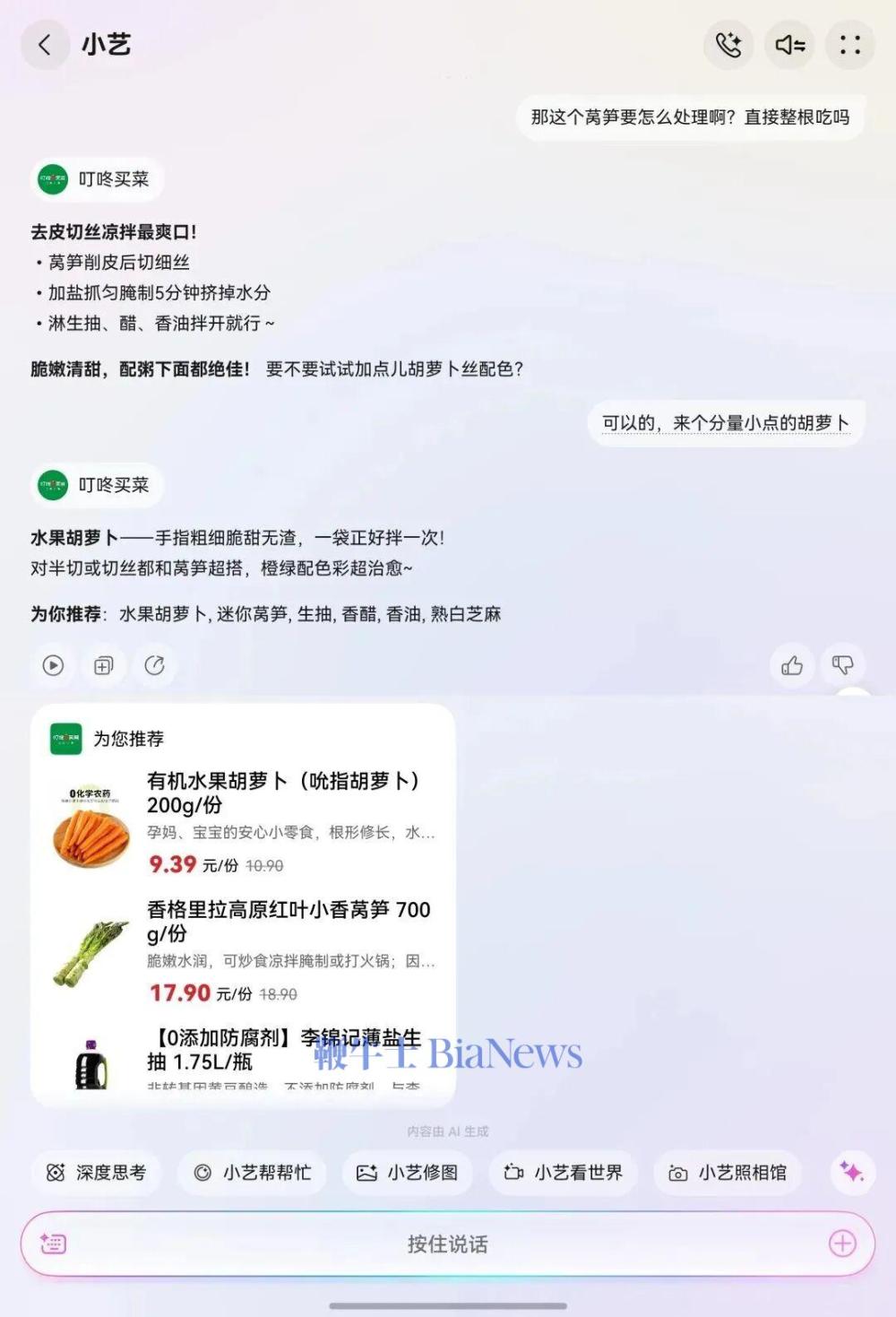 像托尼下厨比较少的,偶尔还会遇到不知道怎么处理的菜,也可以接着问它,推荐的菜要怎么处理。