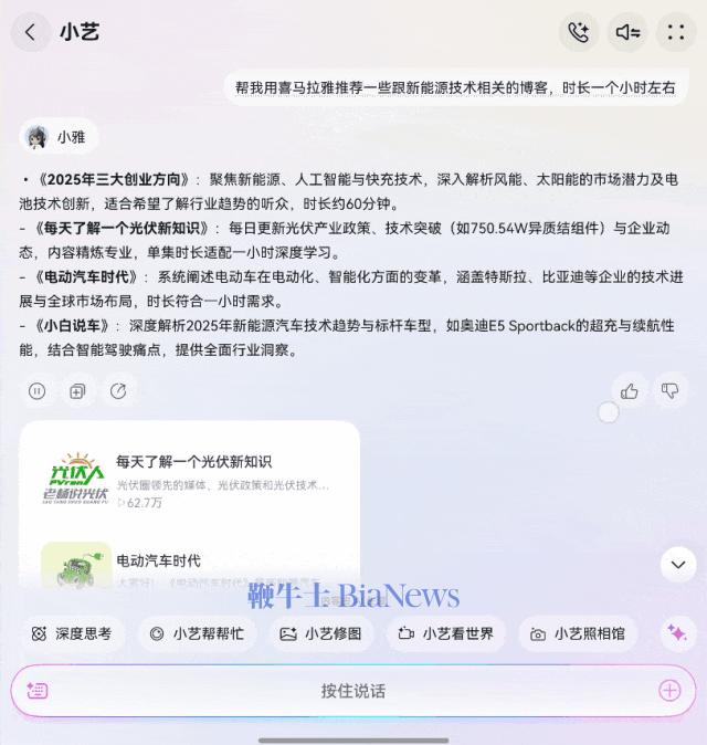 另外还有喜马拉雅的智能体小雅,现版本的小雅能根据要求推荐合适的播客。
