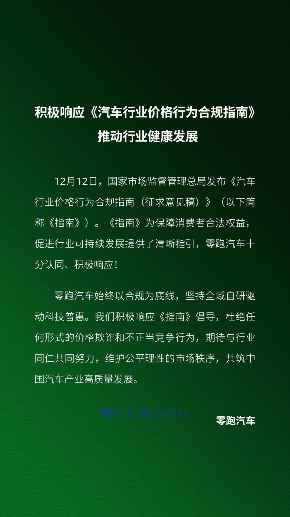 12月14日,零跑汽车发文表示积极响应《汽车行业价格行为合规指南》(以下简称《指南》)。