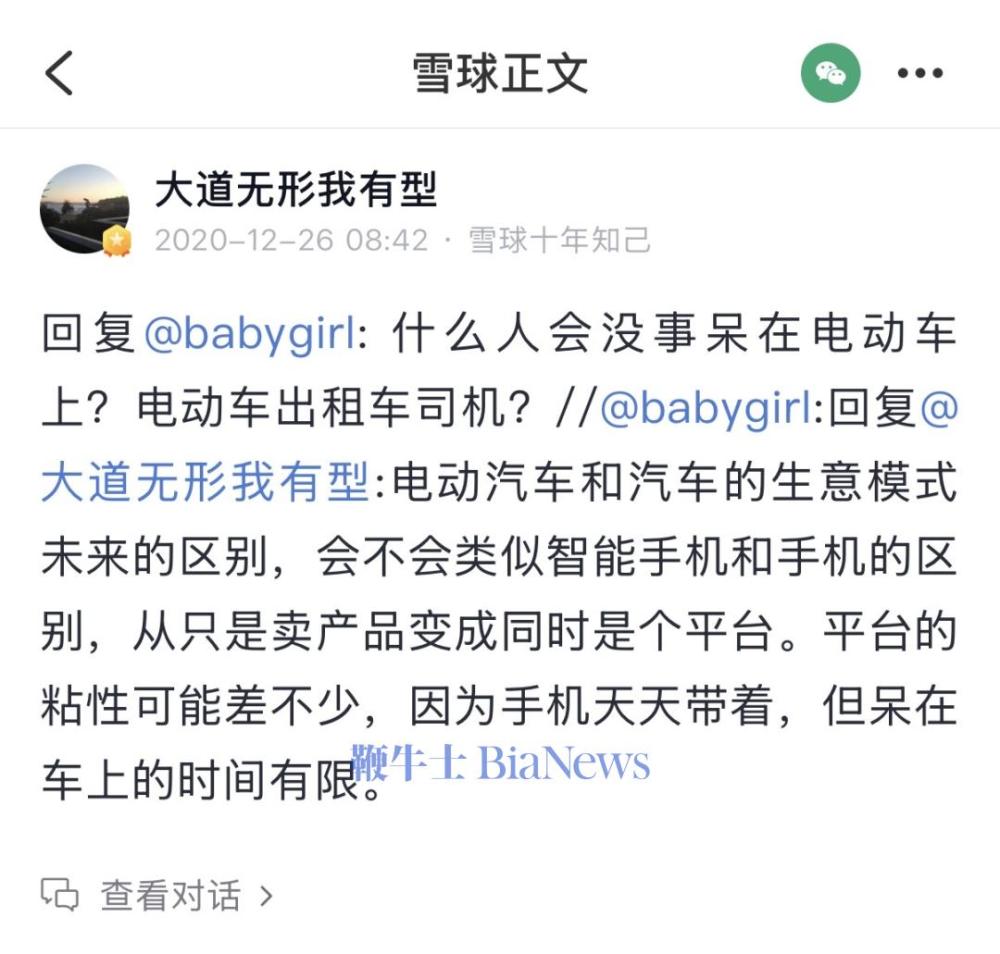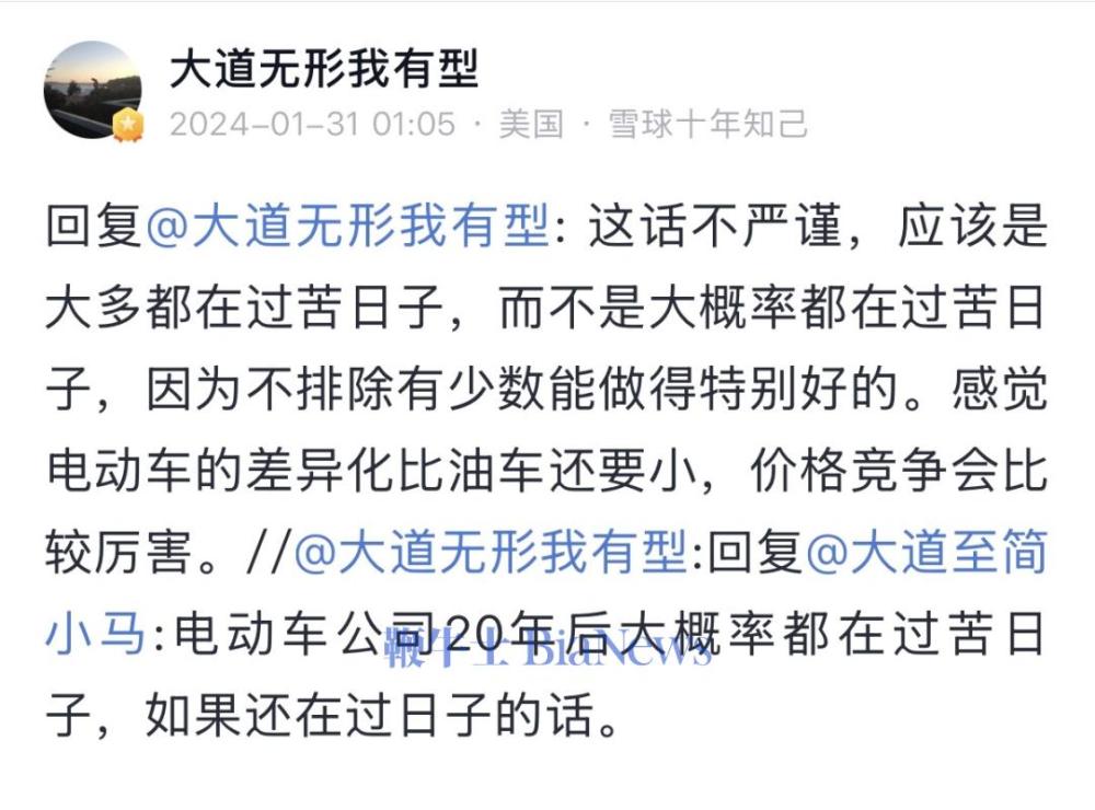 “电动车的同质化会越来越严重,这个行业的商业模式会越来越辛苦。”这是他在2025年3月在雪球上的发言。