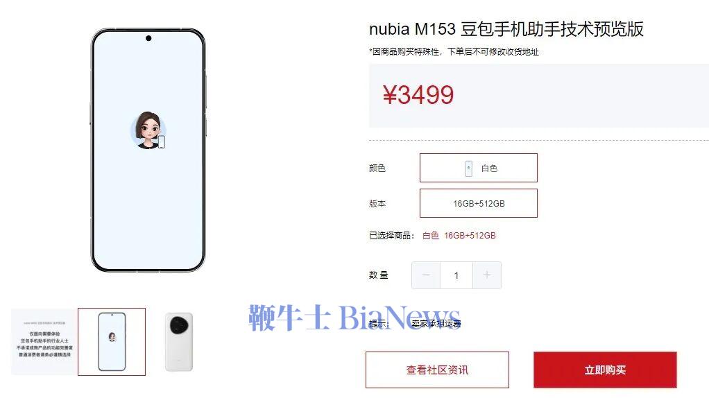 12月16日,根据中兴商城官网显示,豆包手机助手及合作机型nubiaM153目前已重启F码候补申请通道,正式恢复产品购买资格。