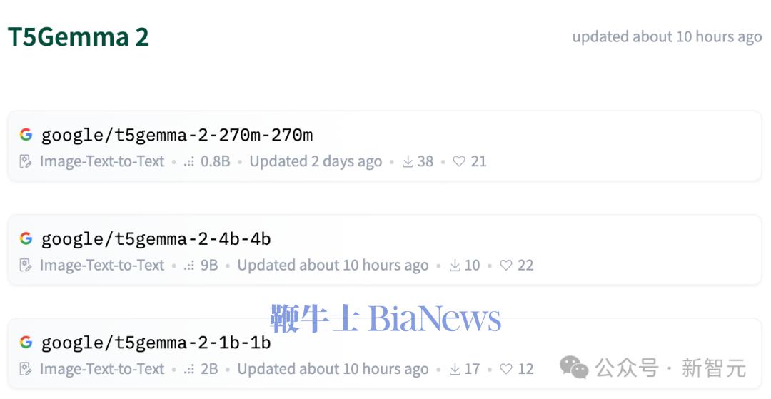 谷歌开源了T5Gemma 2:270M–270M、1B–1B以及4B–4B三种规模的预训练模型。