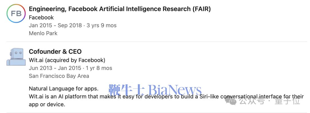 而他与LeCun的交集,则始于2015年的一次关键并购——当时他创立的语音交互平台Wit.ai被Facebook高价收购,他也随之正式加入了Meta的技术生态。