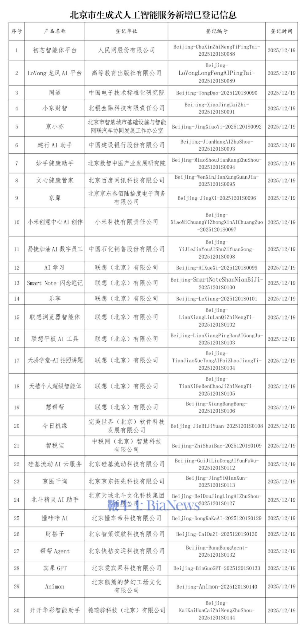 网信北京:北京新增30款已完成登记的生成式人工智能服务