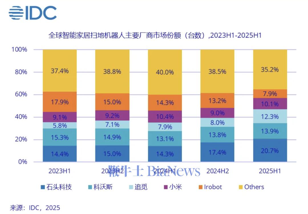 过去几年,追觅在清洁电器领域一路上行。据IDC统计,追觅在扫地机器人市场的市占率逐年提升,从2023年H1的5.8%提升至2025年H1的12.3%,已跻身全球第三。