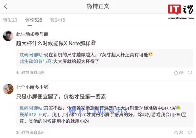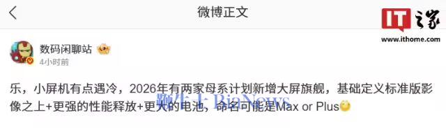 想必会有不少家友回答“5.4 英寸”,毕竟这是当年苹果 mini 机型给出的答案。可惜的是,iPhone 12/13 mini 固然是小屏机的代表,手感那叫一个爽,但受限于尺寸,在配置和体验上有所缺失,没有获得大多消费者的青睐,最终“两代而亡”。纵观这两年的机圈,各家对于小屏机的理解,基本都锁定在“6.3”英寸这个尺寸。从去年开始,被遗忘多年的小屏机掀起一波新的文艺复兴,6.3 英寸左右的旗舰机成为新宠。而到了今年,小屏机更是迎来大爆发时代,多家国产安卓厂商相继挤入这一赛道。并且与过往小屏意味着妥协不同,当下的小屏机在堆料方面丝毫不含糊,打破了尺寸和配置之间的矛盾关系。不仅能配备 6/7000mAh 大电池,还能给到超声波指纹解锁,更能塞入潜望式长焦镜头。曾几何时,小屏机虽然尺寸小,但要牺牲性能、续航、影像等体验;事到如今,却能在保持小的前提下,方方面面的规格都具备不俗水准。只是,本以为小屏机能就此保持火热的态势,但从最新的情报来看,似乎要失宠了。在 12 月 18 日那天,微博博主发文称,小屏机有点遇冷,2026 年有两家母系品牌计划新增大屏旗舰。他透露,基础定义标准版影像之上 + 更强的性能释放 + 更大的电池,命名可能是 Max or Plus。IT之家注:母系品牌的意思是主品牌,例如小米、OPPO、vivo、华为、荣耀等均属于母系品牌范畴,与之相对的是子系品牌,例如 REDMI、一加、iQOO 等。目前,该博主暂未公布母系品牌具体所指。博主还在评论区回复了部分网友的问题:针对超大杯什么时候能做 vivo X Note 那样,他表示:“现在新机的尺寸越做越大,7 英寸超大杯还真有可能。”针对只是小屏便宜,价格才是第一要素的言论,博主回复:“其实不然,今年各家新旗舰普遍是 Pro 大屏销量>标准版中屏小屏。”需要注意的是,2025 年马上结束,2026 年即将到来,在辞旧迎新之后,春节前预计会上演“中端机大乱斗”。据悉,一加 Turbo 6 系列、小米 REDMI Turbo 5 系列、iQOO Z11 Turbo、realme 真我 Neo8、荣耀 Power 2 等蓄势待发。这些新机的卖点,包括但不限于中屏大屏、万级大电池、外围大补齐......今年的机圈称得上“精彩纷呈”,期待明年能继续“再接再厉”。(转载自IT之家)