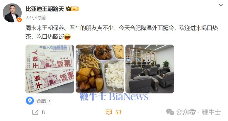 结合路天的博文和配图来看,比亚迪王朝会为到店保养或看车的用户提供专属的“饭票”服务,凭此饭票,用户可享受标准的用餐服务。