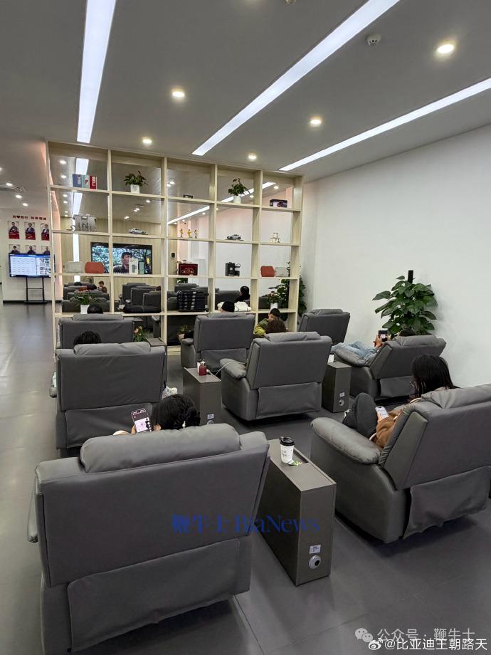 此外,比亚迪王朝还为等待的用户提供了休息室,顾客可以在此喝茶、休息和看电视。