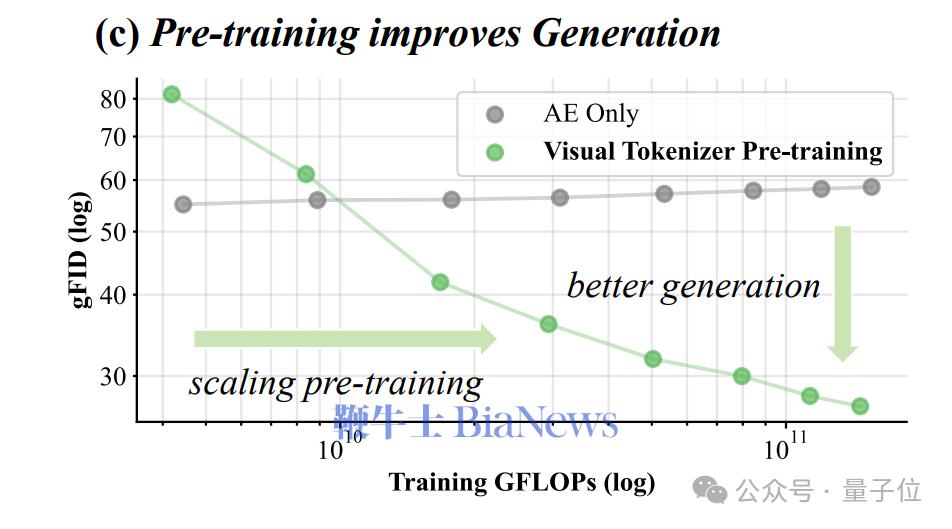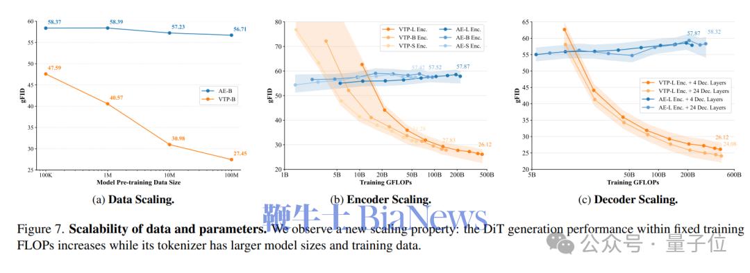 团队在实验中发现,VTP首次展示了Tokenizer的Scaling Law,即生成性能可以随预训练中投入的计算量、参数量和数据规模有效增长。