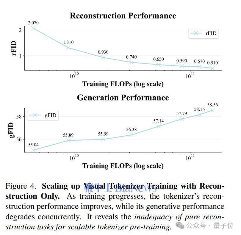 如图所示,传统仅基于“重建”目标训练的Tokenizer(灰线),随着算力投入增加,模型的生成性能不仅没有提升,反而逐渐趋于饱和甚至略微下降。(ps:gFID衡量生成质量,越小越好)