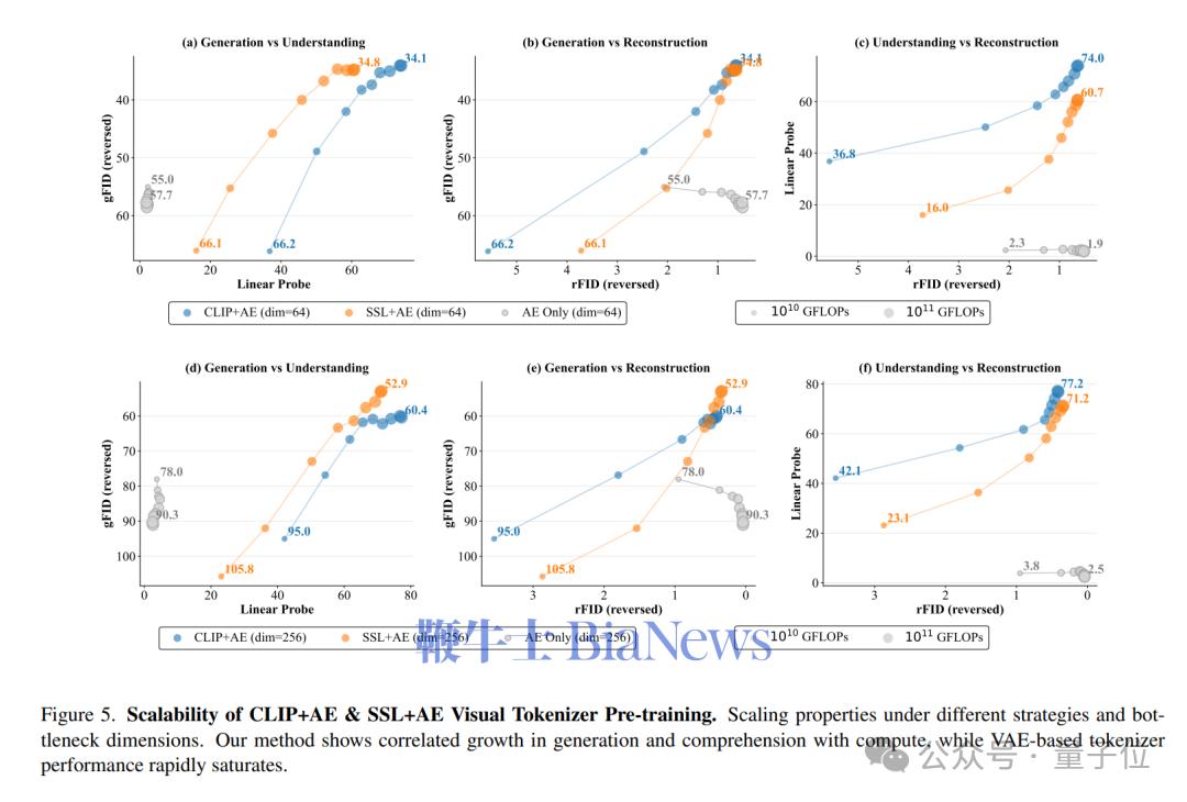 二者呈现明显的正相关,且这种提升会随着训练计算量增加持续推进。相比之下,缺少“理解力”的传统AE Only方案,其生成质量和理解能力很快陷入停滞。
