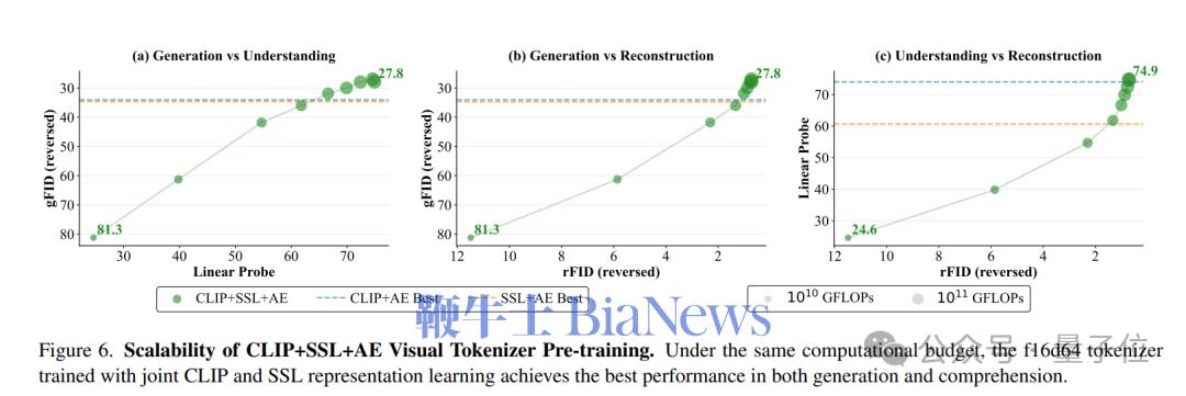 更进一步,团队在同等算力下对比了不同组合,证明“CLIP+SSL+AE”的联合训练方式上限最高,生成与理解指标均最优。