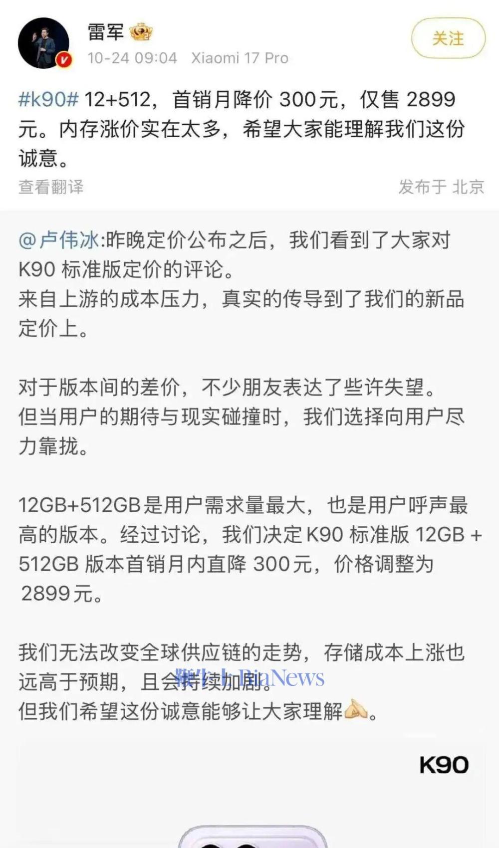 最终小米集团董事长雷军、总裁卢伟冰不得不出面回应,在解释“内存涨价实在太多”之余,以制定首月优惠的方式平息争议。