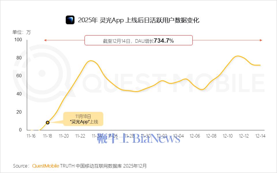 QuestMobile数据显示,截至2025年12月14日,灵光App日活跃用户规模实现7倍增长。