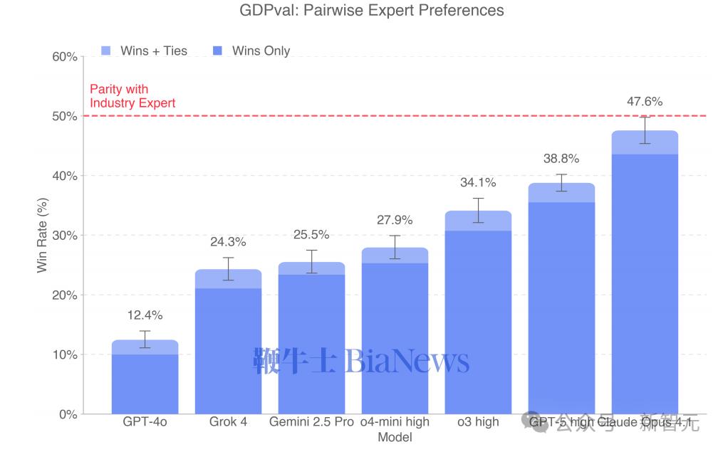 图1:GDPVAL中,不同模型在对应任务上和人类具有相同或更好水平的比例。