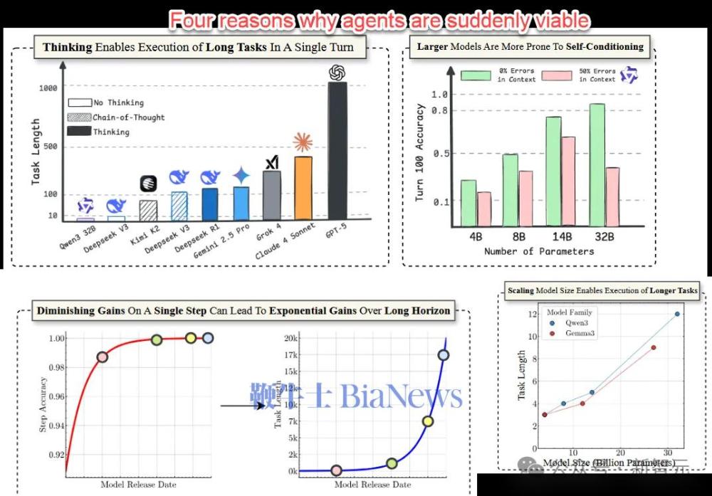 以前,大家认为,AI想独立完成长任务非常难,比如写一个完整的软件。因为AI只要中间错一步,后面就全完了(误差累积)。