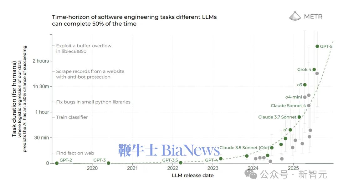 因此,指标METR,从GPT-3到GPT-5,在五年间持续保持了指数级增长,显示出智能体能力增加的速度没有放缓。