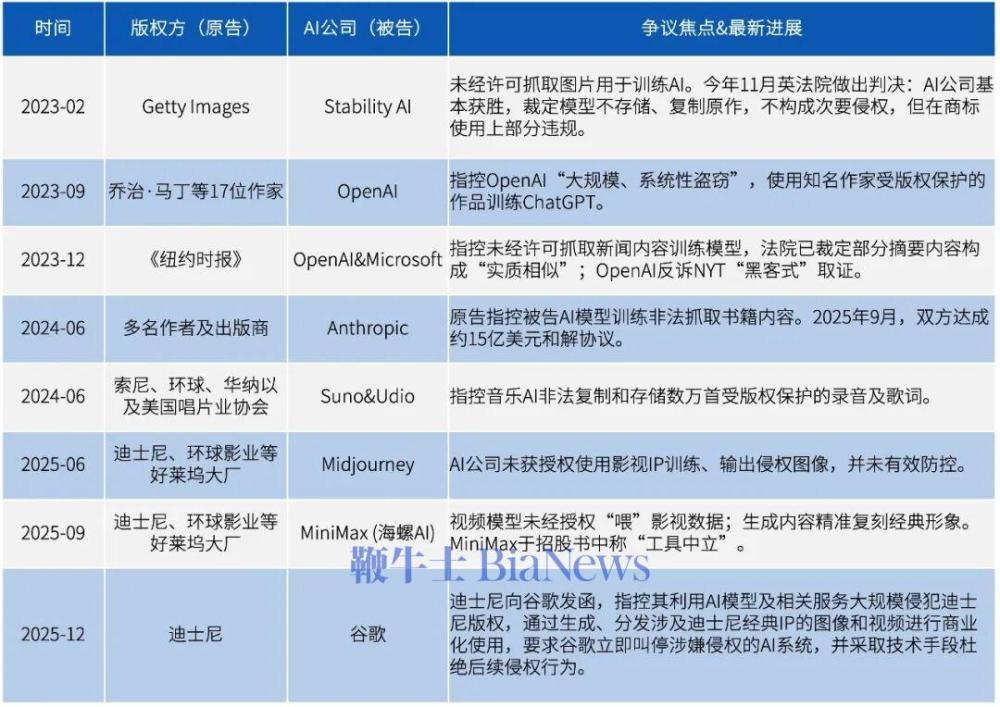 2025年9月16日,迪士尼、环球影业和华纳兄弟作为共同原告,在加州对MiniMax提起诉讼,指控其视频生成工具——海螺AI,在训练、生成与推广三个环节构成侵权。