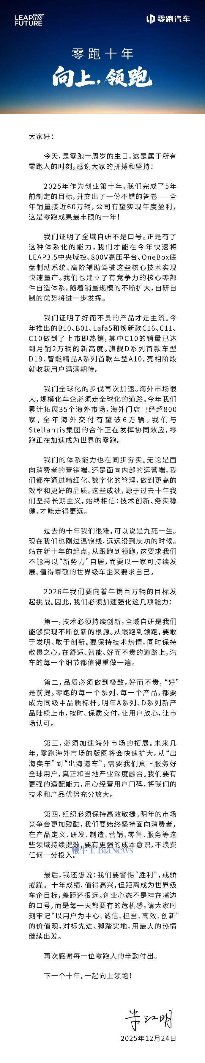 今日,零跑汽车创始人、董事长、CEO朱江明发布零跑汽车十周年全员信。