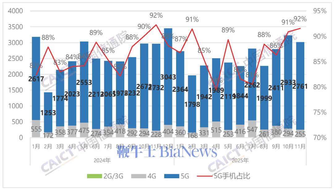 报告指出,2025年11月,国内市场手机出货量3016.1万部,同比增长1.9%,其中,5G手机2761.4万部,同比增长1.1%,占同期手机出货量的91.6%。
