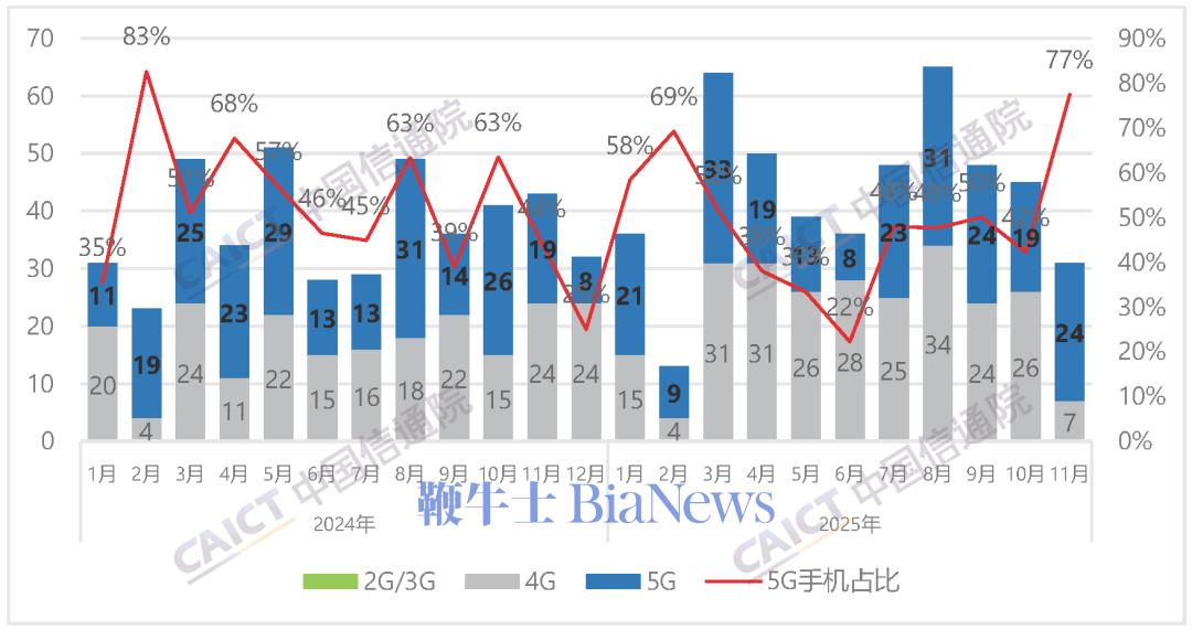 12月25日,中国信通院发布2025年11月国内手机市场运行分析报告。