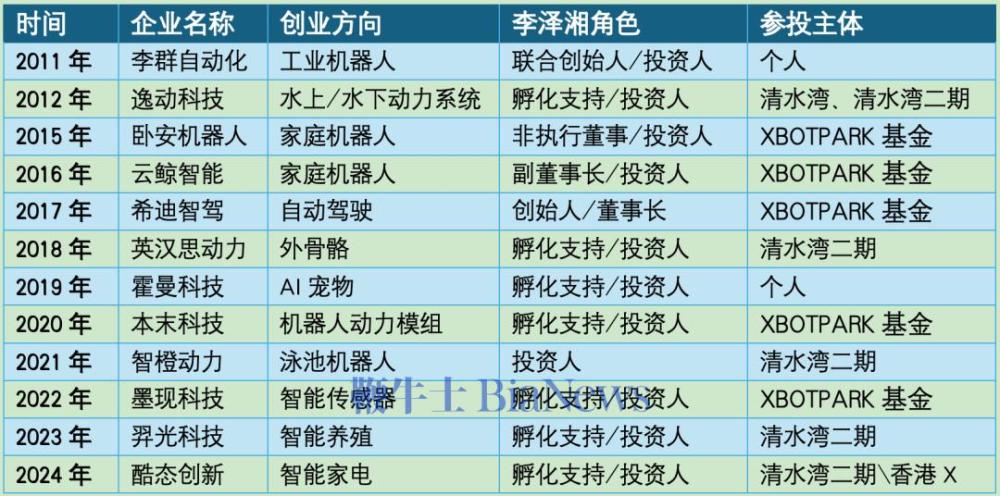 除了自己的创业项目固高科技和众所周知的大疆外,李泽湘投资的知名企业还包括2011年成立的李群自动化、2012年成立的逸动科技、2016年成立的云鲸智能和2017年成立的正浩创新。