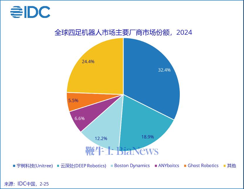 根据IDC数据显示,2024年全球四足机器人市场规模约1.8亿美元,出货量约2万台,云深处以18.9%的销量份额位列第二,仅次于宇树科技(32.4%)。